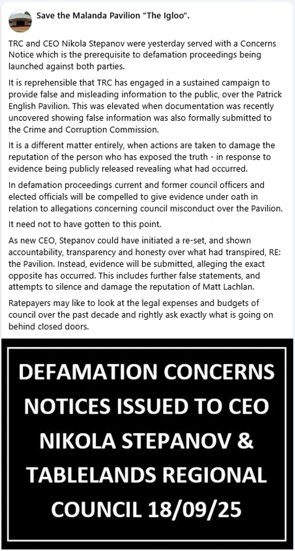 Defamation Concerns Notice issued to CEO Nikola Stepanov and Tablelands Regional Council